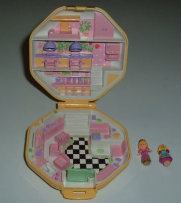 Title (ebay affiliate link): Vintage 1990 Bluebird yellow compact Polly Pocket beauty shop w/2 girl dolls