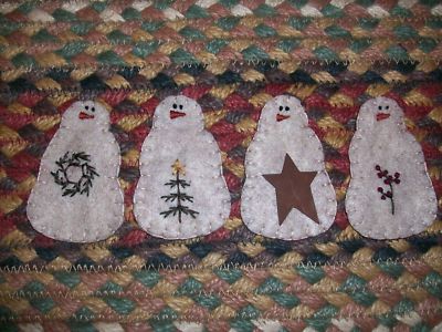 Title (ebay affiliate link): Primitive stitchery Christmas Snowman ornaments ornies *4* Holly Tree Wreath
