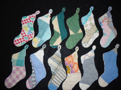 Title (ebay affiliate link): 12 PRIMITIVE ANTIQUE CUTTER QUILT CHRISTMAS SANTA STOCKINGS