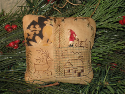 Sampler Pillow 1727 Santa~Log Cabin on Antique Quilt Pines Sled Deer Primitive