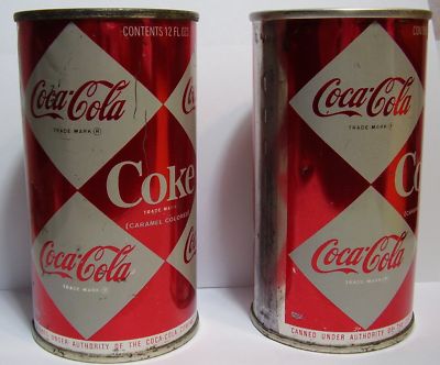 Title (ebay affiliate link): 2 VINTAGE COCA COLA CANS DIAMOND PATTERN WITH 2 DIFFERENT TOPS 1960'S L@@K