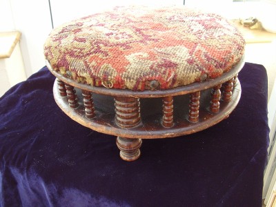 Title (ebay affiliate link): Antique Bobbin Turned Circular Tapestry Top Footstool