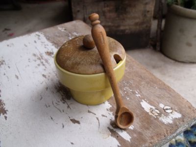 Title (ebay affiliate link): Vintage Primitive Stoneware Mustard Pot With Antique Carved Wood Spoon