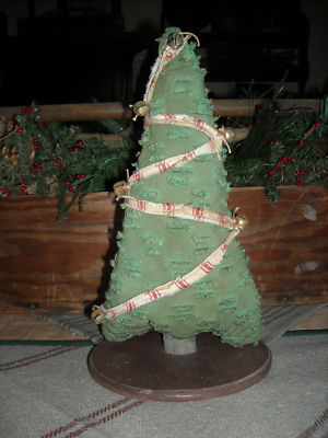 Title (ebay affiliate link): PriM GrEEn ChEniLLe TrEE ~ TiCkIng GaRlAnD ~ RuSty BeLLs ~ MaKeDo WoOdEn BaSe