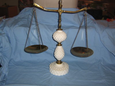 Title (ebay affiliate link): Scales of Justice,Brass, Milk Glass, Hobnail pattern vtg.