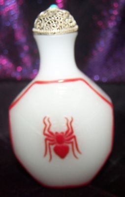 Title (ebay affiliate link): Vintage Snuff Bottle White Milk with Red Glass Spider Metal Spoon Beautiful Lid