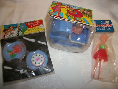 Title (ebay affiliate link): 3 PC LOT PLASTIC TOYS IN PACKAGE 50'S, 60'S?? TEENAGE DOLL, BABY W/BUGGY, FOOD