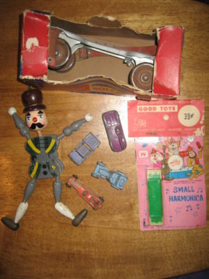 Junk Drawer lot vintage toys roller skate harmonica tootsie toy car toy soldier