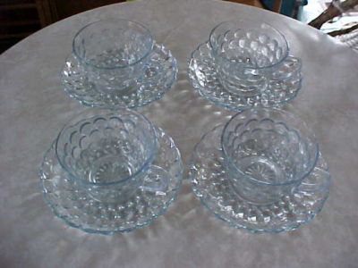 Title (ebay affiliate link): FOUR Sapphire Blue Bubble Depression Glass Cups & Saucers Anchor Hocking ExcCond