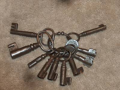 10 ANTIQUE EARLY CLOCK KEYS AND KEY RING