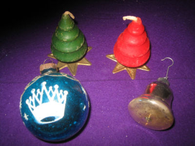 Vintage 2 Shiny Brite Ornaments 1 w/ Crowns, Bell, 2 West Germany Candle Holders