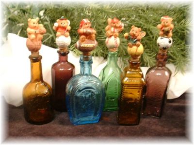 Title (ebay affiliate link): 6 OLD MINIATURE GLASS BOTTLES ORIG. CORK BEAR SPORTS STOPPERS FINIALS