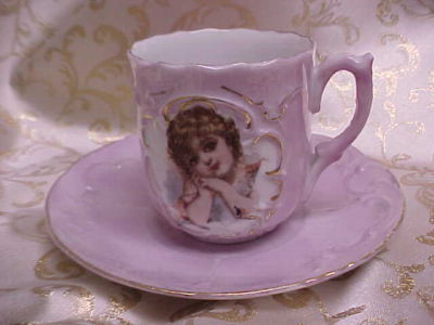 CUP & SAUCER DEMITASSE PINK EMBOSSED WITH VICTORIAN GIRL EUROPEAN