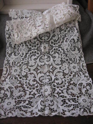 Title (ebay affiliate link): ANTIQUE SCHIFFLI EMBROIDERED COTTON LACE RUNNER DRESSER SCARF TRIM DOLL CraftS