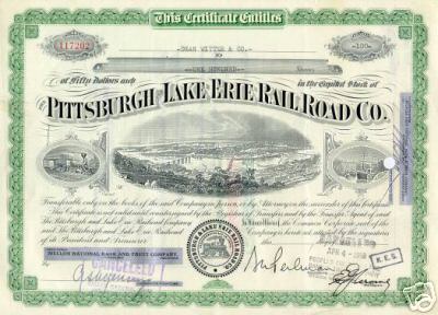 Title (ebay affiliate link): Old Pittsburgh & Lake Erie Railroad stock certificate authentic w/ city vignette