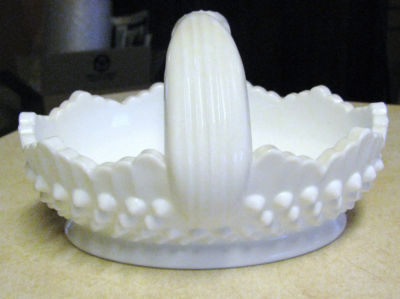 Title (ebay affiliate link): VINTAGE FENTON HOBNAIL SPLIT HANDLED BASKET SCALLOPED RIM WHITE MILK GLASS