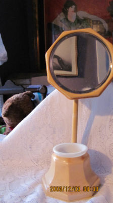 Title (ebay affiliate link): Vintage Antique Catalin Shaving Stand with Mirror & White Milk Glass Shaving Mug