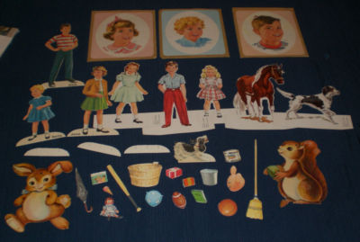 Title (ebay affiliate link): Lot Vintage Dick and Jane Cutouts Cardboard Visual Reading Aids Paper Dolls Old