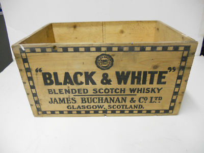 Title (ebay affiliate link): Antique Wooden Box Crate Black & White Blended Scotch Whiskey Scotland Boston
