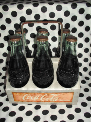 Title (ebay affiliate link): Vintage Coke Coca Cola Metal Carrier Caddy with 6 Full 6oz Green Bottles Antique