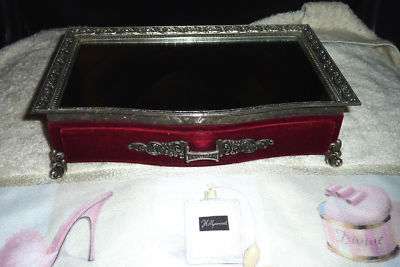 Title (ebay affiliate link): BEAUTIFUL VINTAGE SILVER TRINKET JEWELRY BOX WITH MIRROR AND DROW RED VELVET