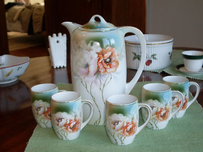 ANTIQUE HAND-PAINTED GERMAN PORCELAIN CHOCOLATE POT with CUPS