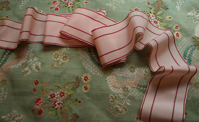 Title (ebay affiliate link): ANTIQUE FRENCH MILLINERY RIBBON WOVEN STRIPE 3X44 HAT CRANBERRY SHELL PINK DOLLS
