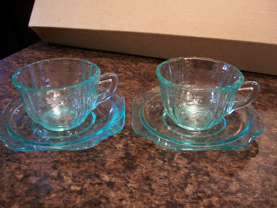 Title (ebay affiliate link): INDIANA GLASS FEDERAL MADRID TEAL RECOLLECTION TWO CUPS & SAUCER PLATES