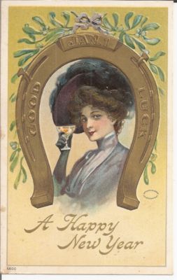 Title (ebay affiliate link): Old New Year Postcard of A Pretty Lady in a Hat Toasting-Framed by Horseshoe