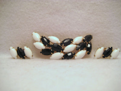 VINTAGE GOLDTONE WITH MILK GLASS AND JET BLACK RHINESTONES BROOCH & EARRING SET