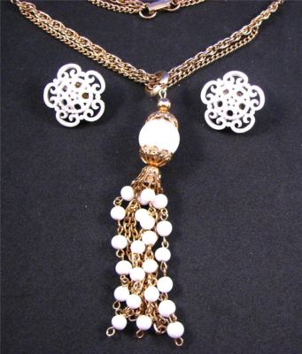 Title (ebay affiliate link): VINTAGE VICTORIAN STYLE NECKLACE & EARRING DEMI MILKGLASS & ENAMELED 22" LG.