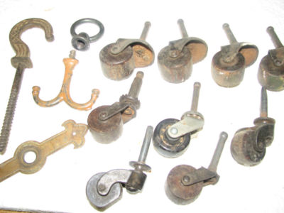 Title (ebay affiliate link): 9 antique casters, wheels, rollers + hooks & misc