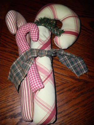 Title (ebay affiliate link): Primitive Christmas bundle shelf wall door decor 3 pillow tick fabric candy cane