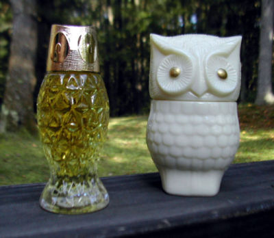 Title (ebay affiliate link): Pair Vintage Avon Owl Sachet & Cologne Perfume Bottles - Milk & Clear Glass