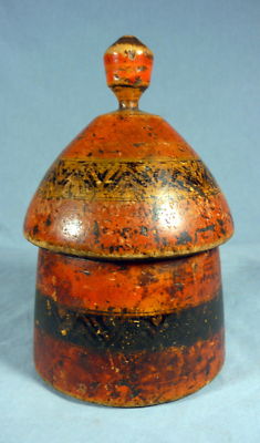 Early Antique Treenware Covered Trinket Box, Polychrome, Round Treen