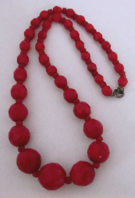 Vintage Faceted Cherry-Red Milk Glass Bead Necklace Czech