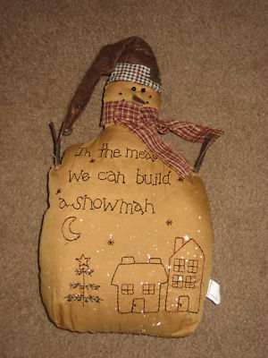 Title (ebay affiliate link): TEA STAINED FABRIC PRIMITIVE STITCHERY RUSTIC SNOWMAN CHRISTMAS DECORATION