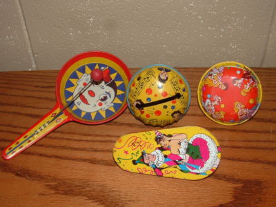 4 Vintage Tin Litho Noisemakers Neat Items!!