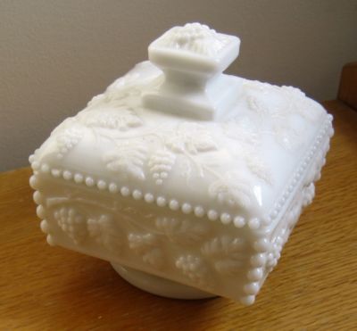 Title (ebay affiliate link): Vintage Westmoreland Paneled Grape Milk Glass Square Pedestal Covered Compote