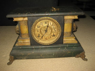 Title (ebay affiliate link): Antique GILBERT Blackwwod ADIMANTINE Shelf Mantle Green MARBLED Wood CLOCK