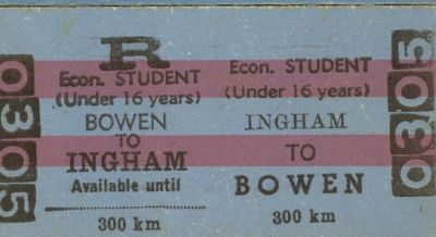 Railway ticket Queensland Ingham Bowen student economy return unused