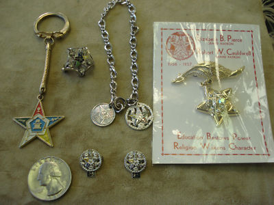 Title (ebay affiliate link): Antique Eastern Star Jewelry; 2-25 year sterling pins, charm bracelet, keychain