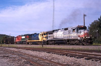Orig. Slide: Montreal Maine & Atlantic 8525 Action, 3 GE's Lashup