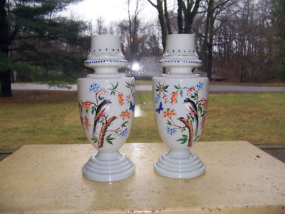 pair Bristol Glass vases - bluebirds, butterflies - pale gray