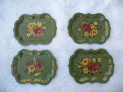 4 Vintage HAND PAINTED CHIPPENDALE Tole Trays~GREEN Floral~