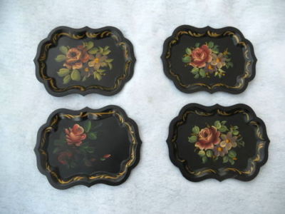 4 Vintage HAND PAINTED CHIPPENDALE Tole Trays~Black Floral~