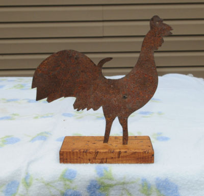 Title (ebay affiliate link): PRIMITIVE HAND CUT TIN ROOSTER HEN MOUNTED on WOODEN BASE