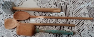 Title (ebay affiliate link): ANTIQUE VINTAGE COOKING UTENSILS WOOD WOODEN SPOONS POTATO MASHER TENDERISERR