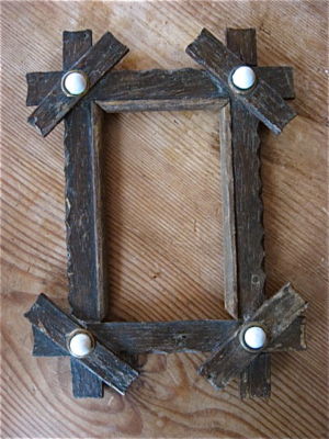 ANTIQUE UNIQUE TRAMP ART WOOD PICTURE FRAME WITH PORCELAIN DETAIL