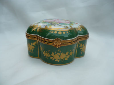 Antique vintage snuff box vanity casket porcelain green with floral motif gold
